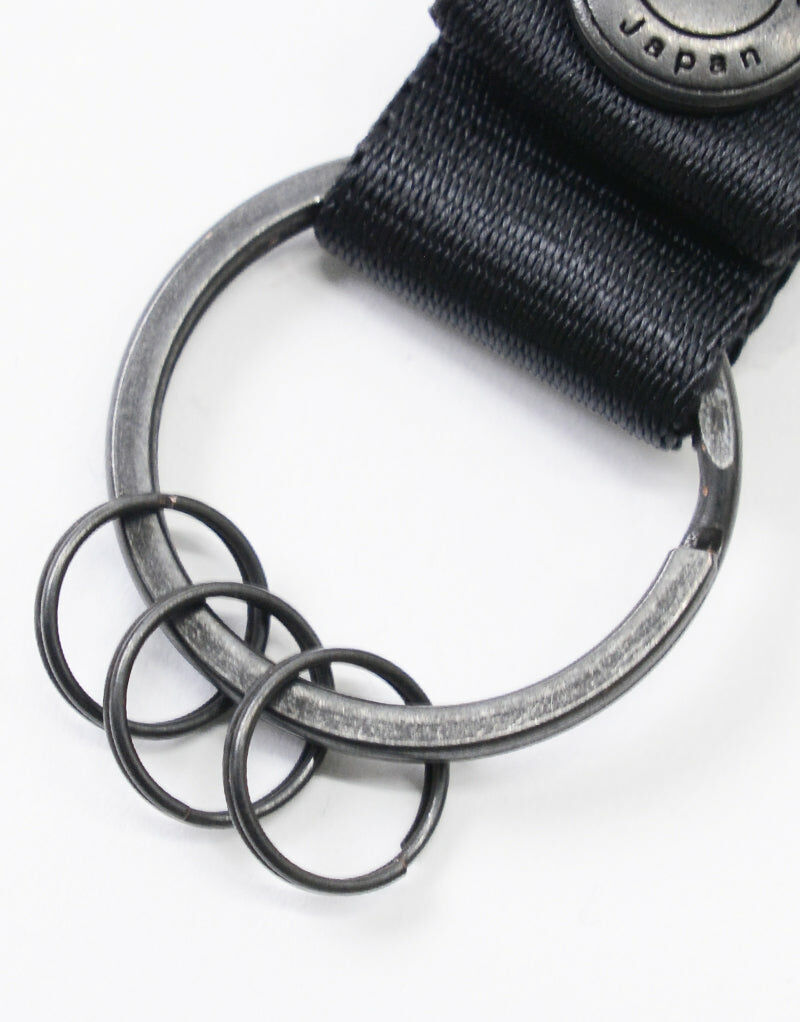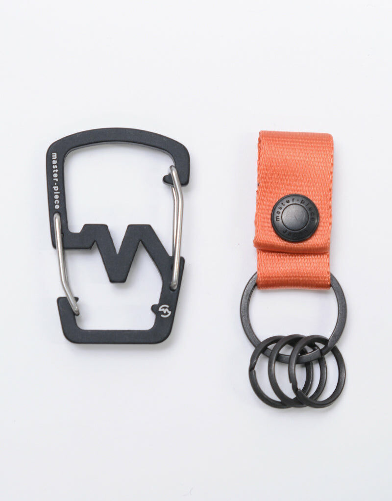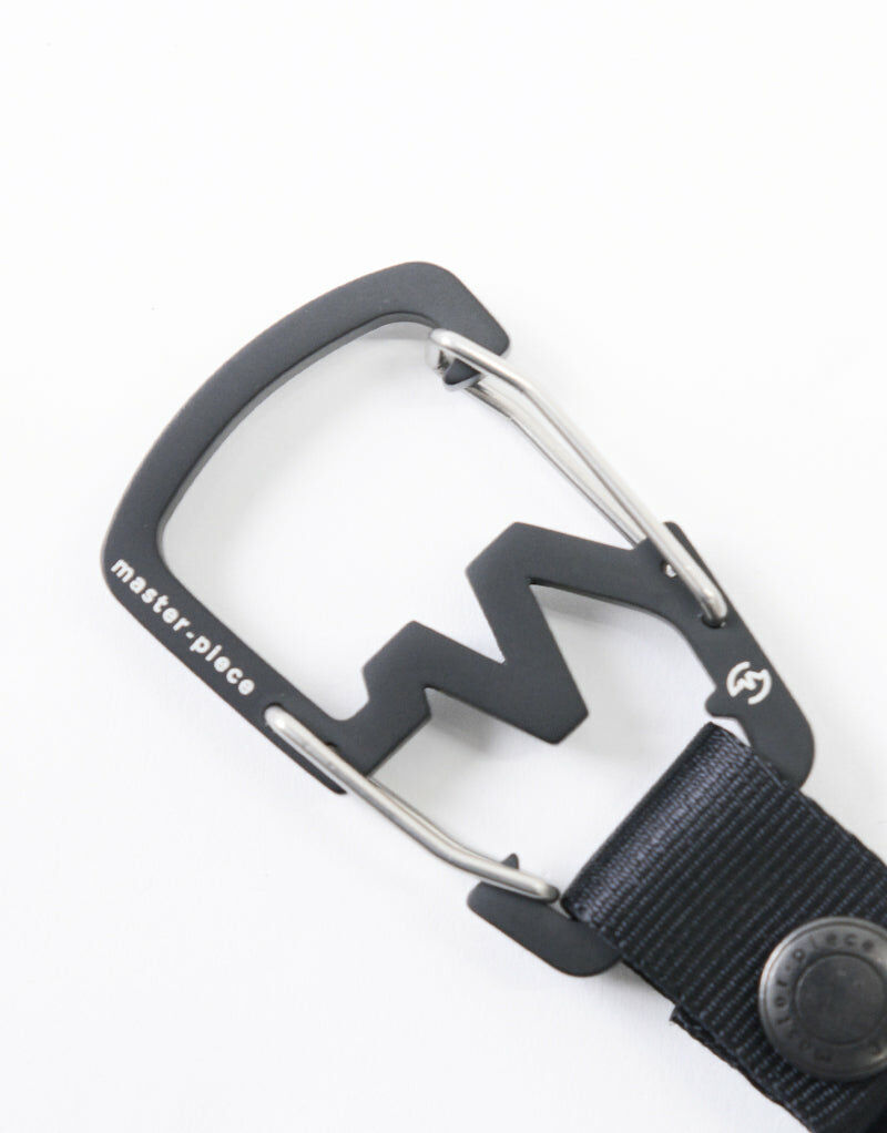 這款鑰匙圈以master-piece的LOGO為靈感,擁有雙扣的鋁製扣具,是其特色之處。尼龍帶部分裝有雙環,可方便固定鑰匙等物品。同時,可通過按扣將其與扣具分離,尼龍織帶部分可單獨使用。扣具上的LOGO經過雷射刻印設計。