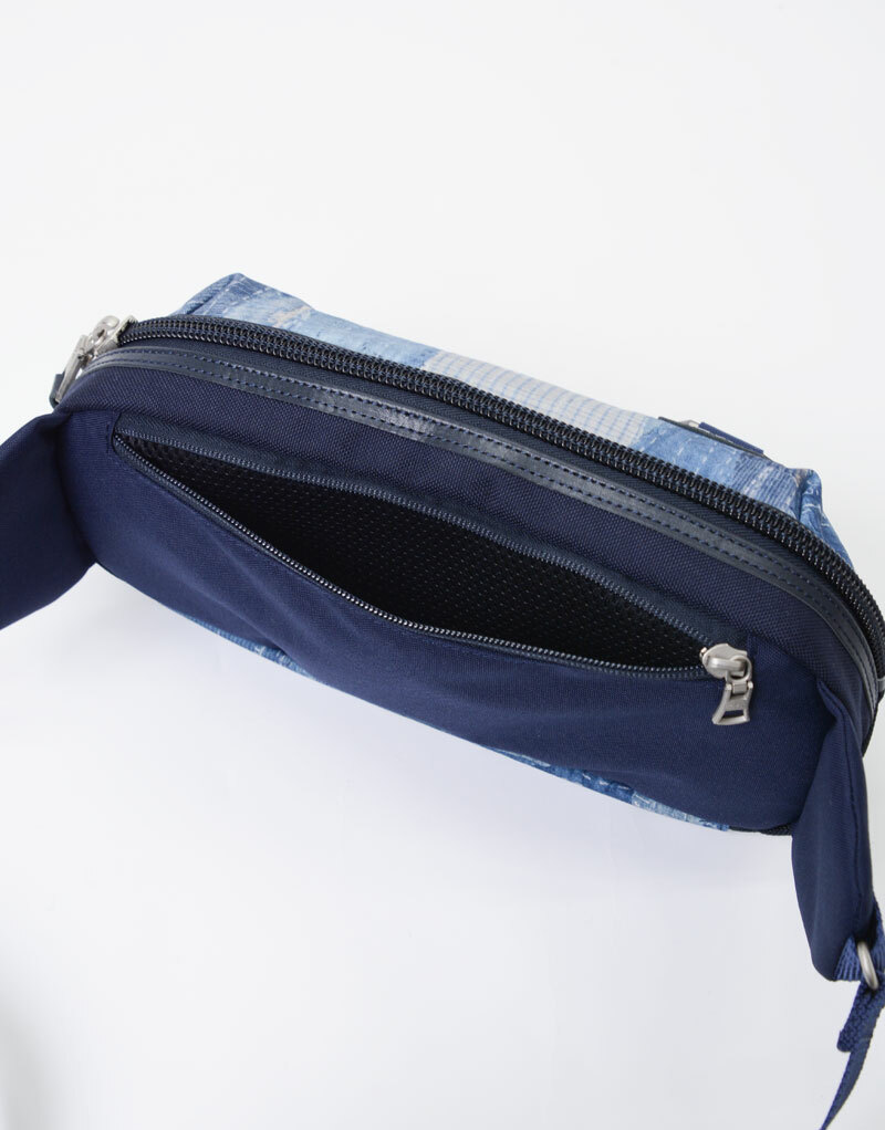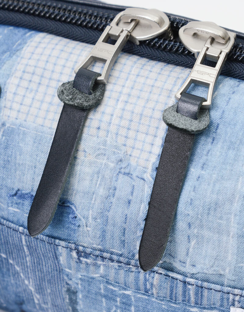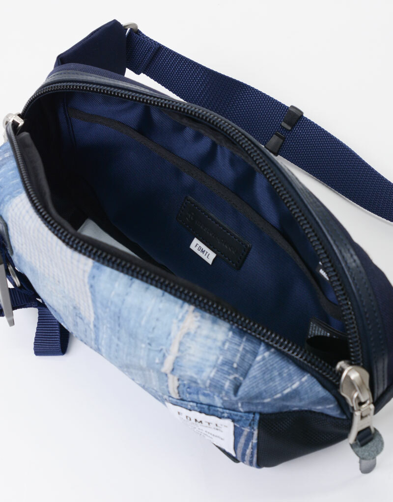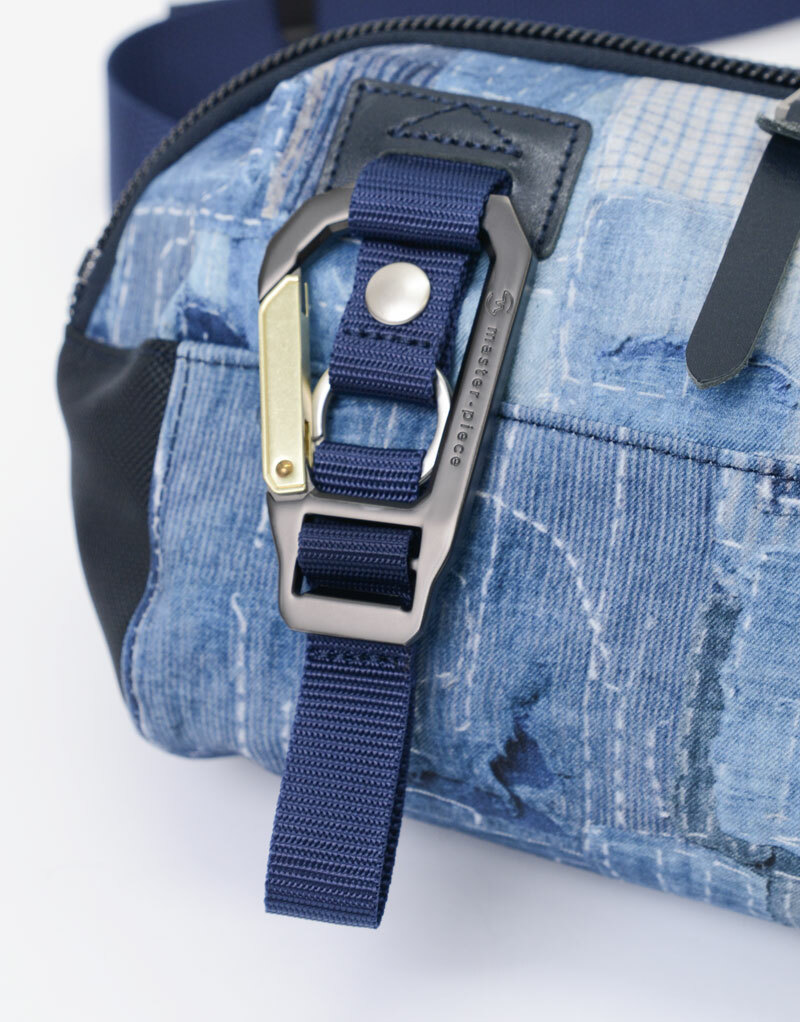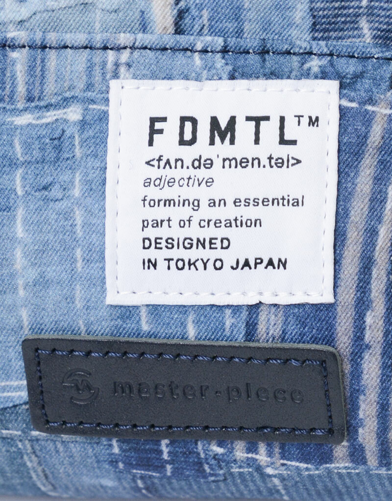 主體面料使用縱/橫系320d撥水加工尼龍,經小松精練株式会社專利技術KONBU-N特殊加工,使原來滑順的尼龍織線提升表面硬度,更具有如昆布般的乾燥手感與皺摺;為重現FDMTL品牌特有的丹寧布拼接花紋,委託數位轉寫業界領頭羊 小松精練株式会社以獨家印染技術 – MONALISA進行丹寧布的擬真轉寫,其高達1670萬的色彩量與熟練職人的精準控制及高度技術足以重現各式擬真效果並持久不易褪色,且其轉寫加工過程大幅降低能源、水、各式資源之使用與排放,無使用定色藥品、染料等,為兼顧社會責任之環境配慮型素材。附屬材質則使用高品質指標的INVISTA社CORDURA Ballistic® fabric 1680d尼龍,其具備超越一般尼龍5倍耐摩耗、撕裂之強度,於1680d布料內裏施以PVC加工使素材全面兼顧耐磨損即抗水機能,為顧慮流行與素材機能之結合。附屬皮革排除使用污染誘因的各種藥品與染料以及各種對人體有害的物質及六價鉻,僅使用100%雙重單寧酸鞣製加工,為以環境與人體為優先考量的環保製程天然皮革(NISSENKEN環保規格認證)。以FDMTL品牌識別丹寧布拼接加工以獨特的轉寫技術重現,將簡單的素面尼龍布料經兩道不同的加工流程轉變為全新素材,全新概念的異素材拼接為master-piece與FDMTL跨界合作的最新款式。