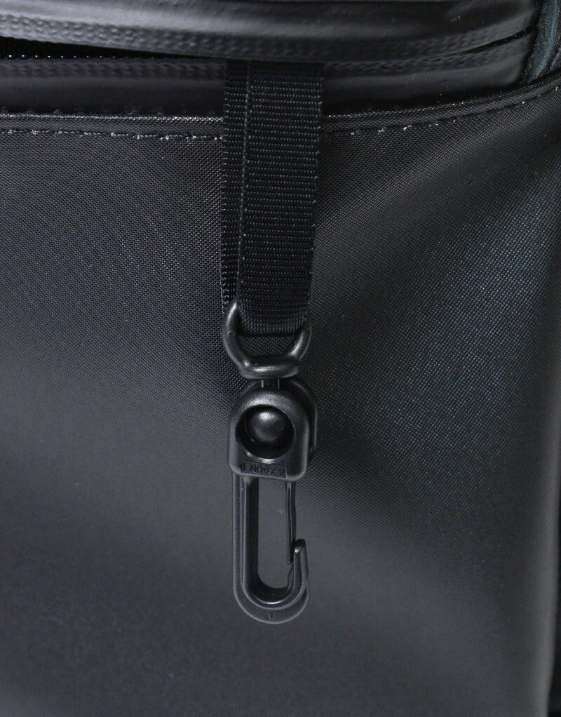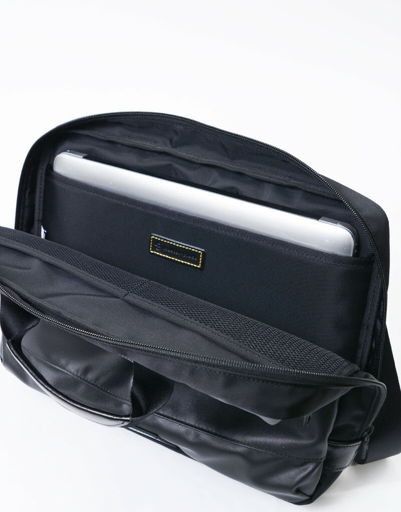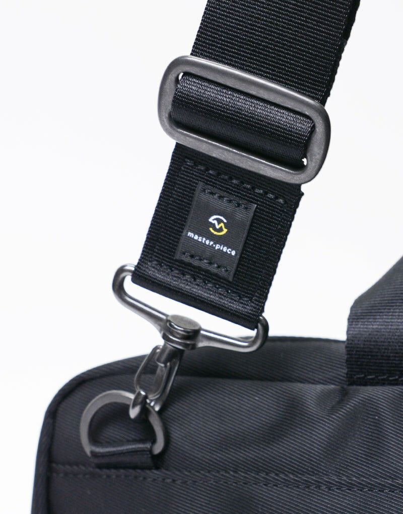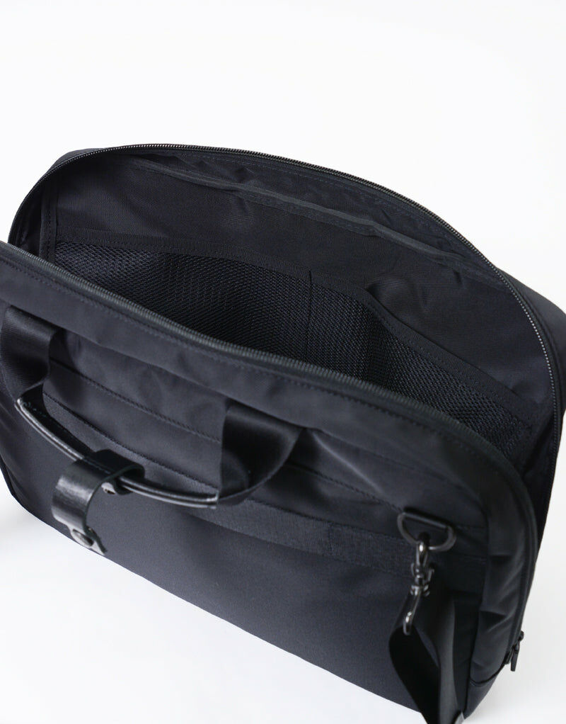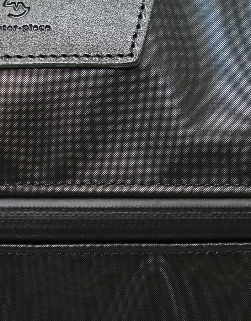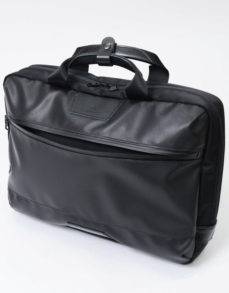 主體面料使用縱系三本撚、橫系使用二本撚的100d特殊尼龍線交織而成,左斜紋編織的尼龍斜紋布反面施以0.15mmPVC貼合加工提高表布潑水效果與耐久性。左綾比右綾織法較輕,因此比右綾產生更多獨特光澤感及柔軟度,布料表面也無凹凸感較平滑柔順。附屬皮革由混合牛皮製程將其磨邊並結合,以一定的速度內進行油脂加工處理後進行染色以具有柔軟性和色牢度,其後進行研磨加工(使皮革產生紋理和光澤)成為具有獨特質地的皮革。 主要拉鍊使用YKK拉鍊在材質上具有高度潑水效果,與包身正面使用具有防水塗層的YKK Aqua-Cadre拉鍊,搭配筆電夾層和錢包夾層。高機能的組合為實用度倍增的新提案商務系列。