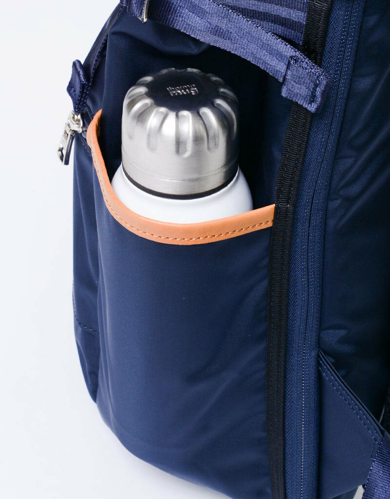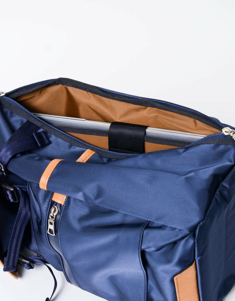 主體面料使用縱系三本撚、橫系使用二本撚的100d特殊尼龍線交織而成,左斜紋編織的尼龍斜紋布反面施以0.15mmPVC貼合加工提高表布潑水效果與耐久性。左綾比右綾織法較輕,因此比右綾產生更多獨特光澤感及柔軟度,布料表面也無凹凸感較平滑柔順。附屬皮革由混合牛皮製程將其磨邊並結合,以一定的速度內進行油脂加工處理後進行染色以具有柔軟性和色牢度,其後進行研磨加工(使皮革產生紋理和光澤)成為具有獨特質地的皮革。 主要拉鍊使用YKK拉鍊在材質上具有高度潑水效果,與包身正面使用具有防水塗層的YKK Aqua-Cadre拉鍊,搭配筆電夾層和錢包夾層。高機能的組合為實用度倍增的新提案商務系列。