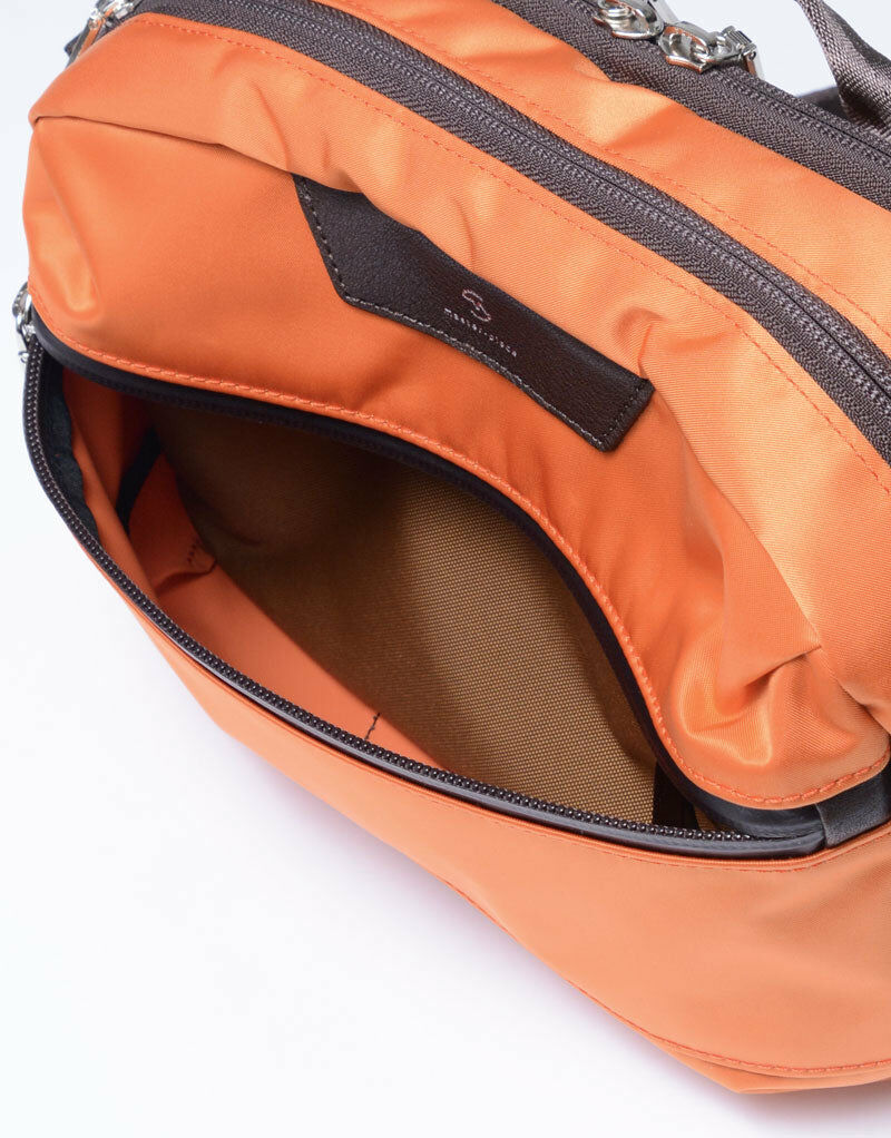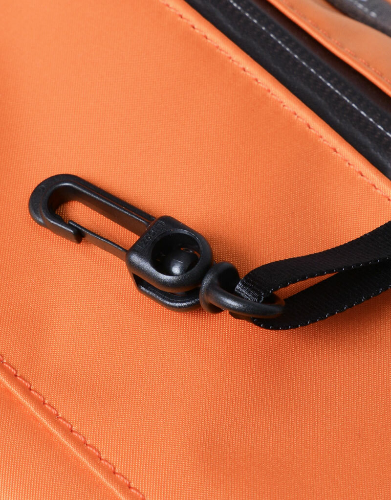 主體面料使用縱系三本撚、橫系使用二本撚的100d特殊尼龍線交織而成,左斜紋編織的尼龍斜紋布反面施以0.15mmPVC貼合加工提高表布潑水效果與耐久性。