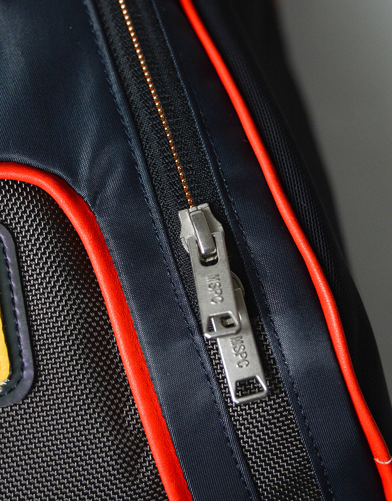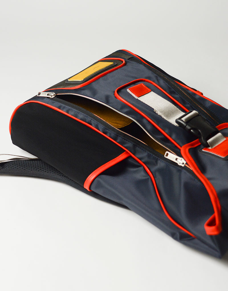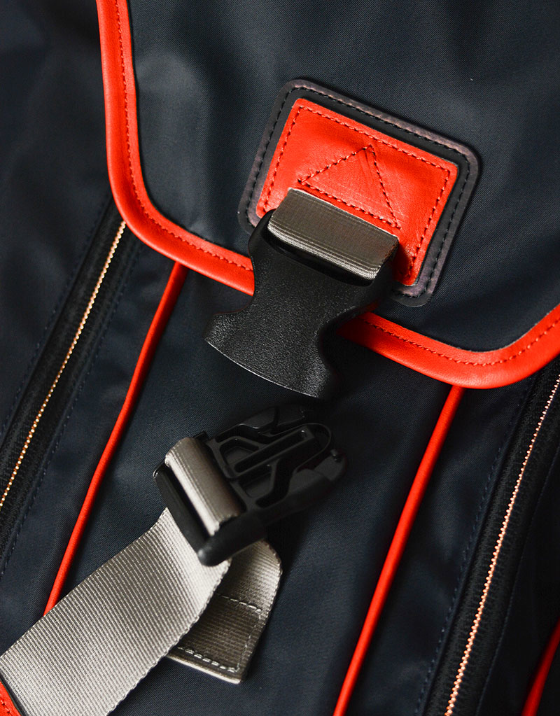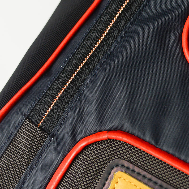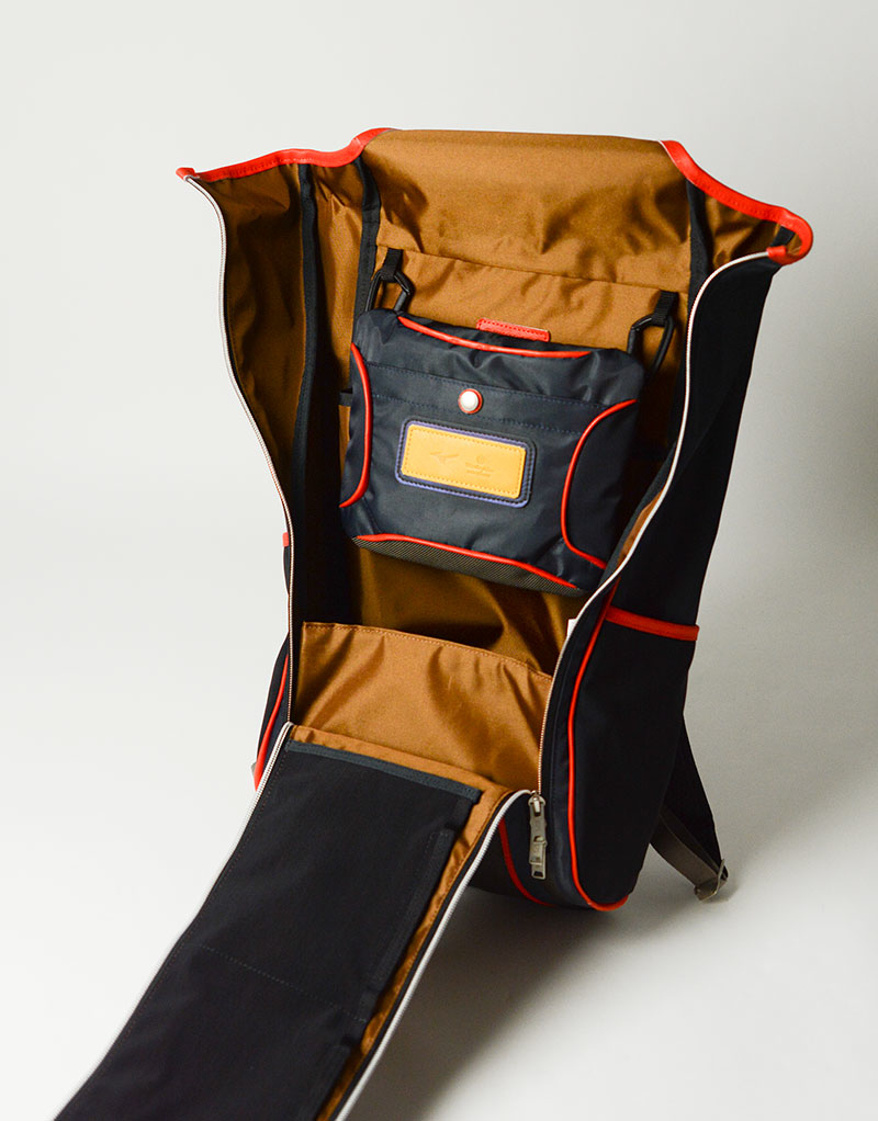 主要材質採用尼龍經紗110d 、緯紗陽離子聚酯纖維150d。以品牌雙方的代表色為設計主體顏色概念,搭配以特殊染色技術製成的斜紋平織布料。並在背面貼合防水膜及Tricot尼龍的3層1布結構材質。附屬皮革為MIZUNO會社製作棒球手套所用亞利桑納州產小牛皮革,經鞣製後仍保持厚實、輕量並有獨特彈性手感,因原本即屬於用於製作運動裝備之皮革,其不易變形之耐久性與耐熱特性均相當優異,無透染的染色加工於日後使用也將增添特殊色澤變化。品牌聯名標車縫在彩色反光素材上搭配高機能感的滾邊設計,結合流行時尚與運動機能風格。此回與運動品牌MIZUNO聯名系列為第三彈。
