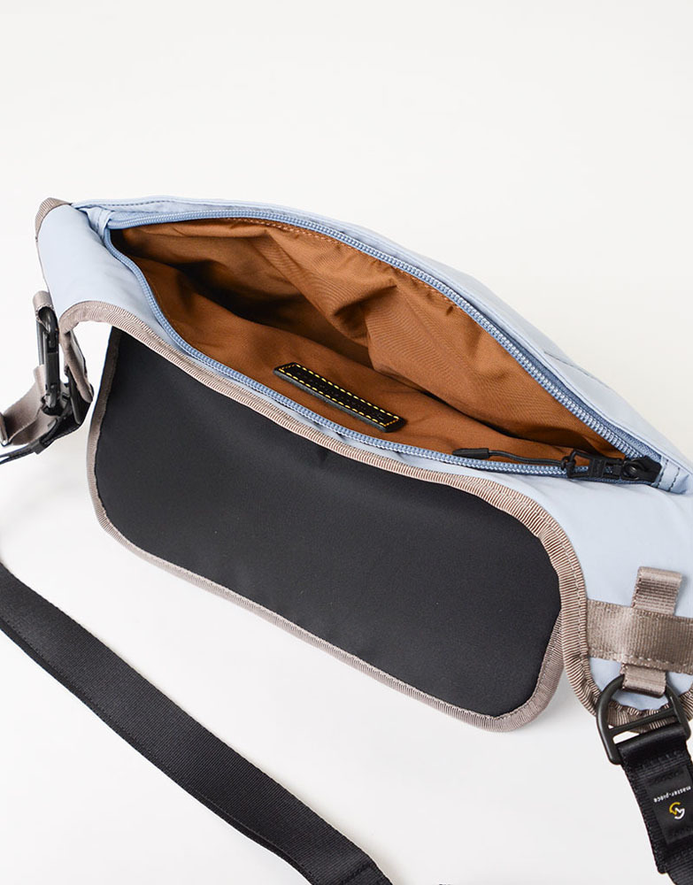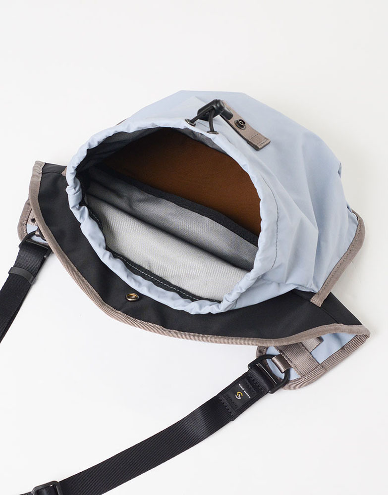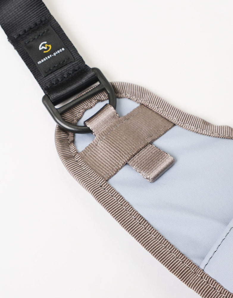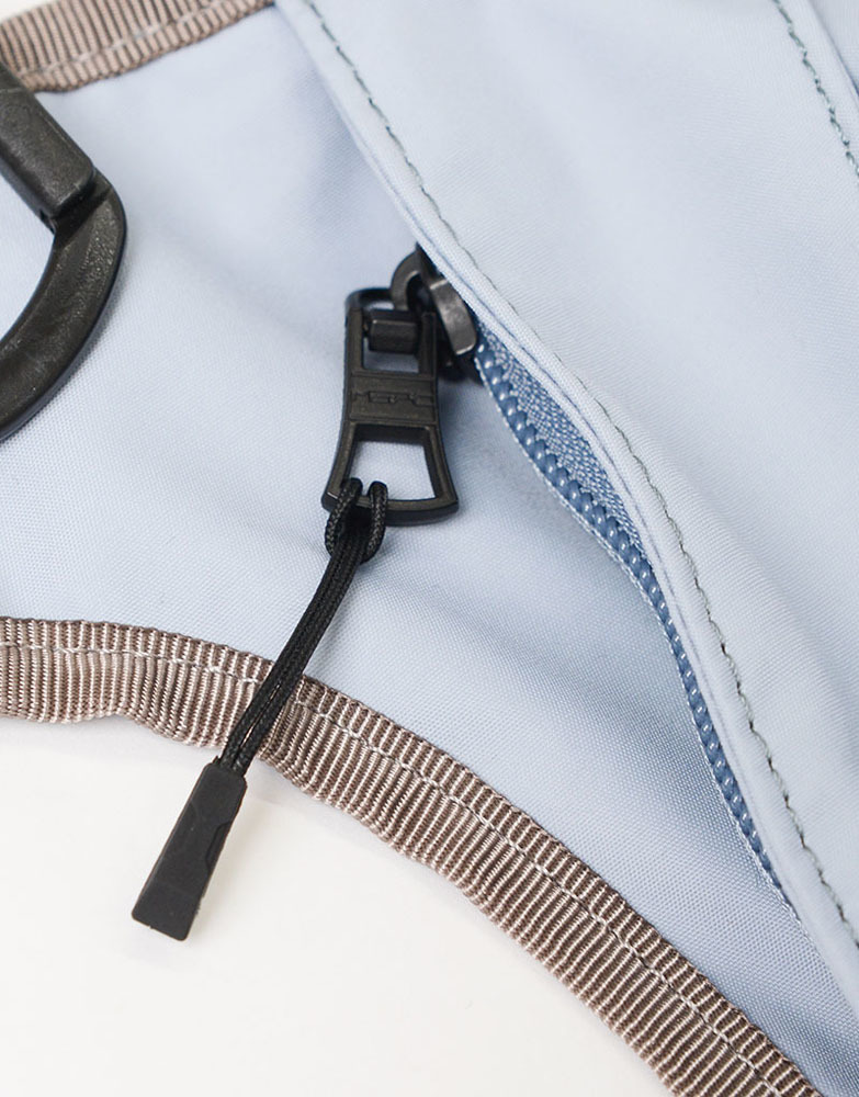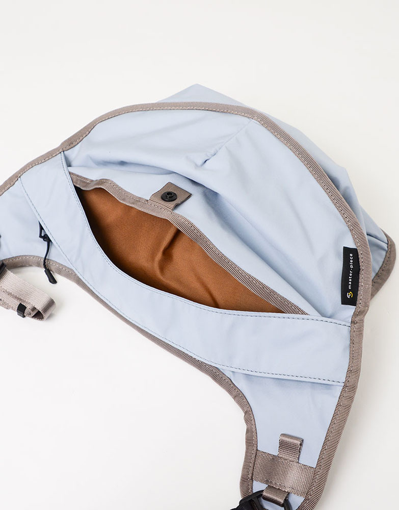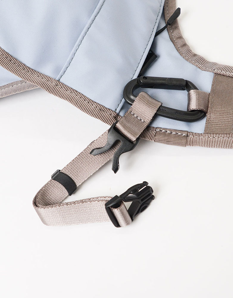 此包型可背在前側使用,順著身型的弧度、一體感的獨特設計。有束口型的瓶裝口袋設計(500ml寶特瓶大小),可將隨身物品與飲品分層收納。另外也有登山勾及可調式扣具配件設計,可掛毛巾、鑰匙等小物使用。