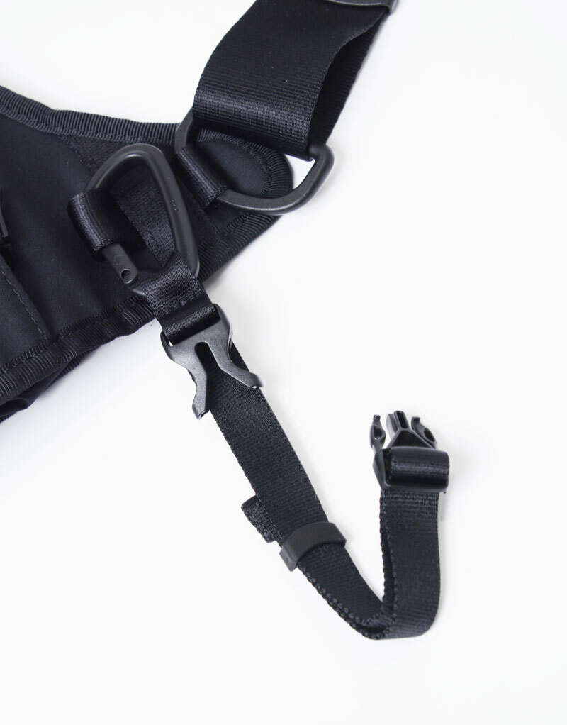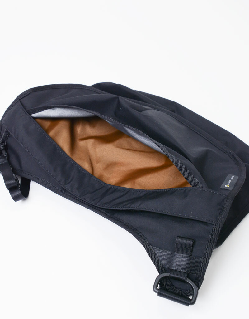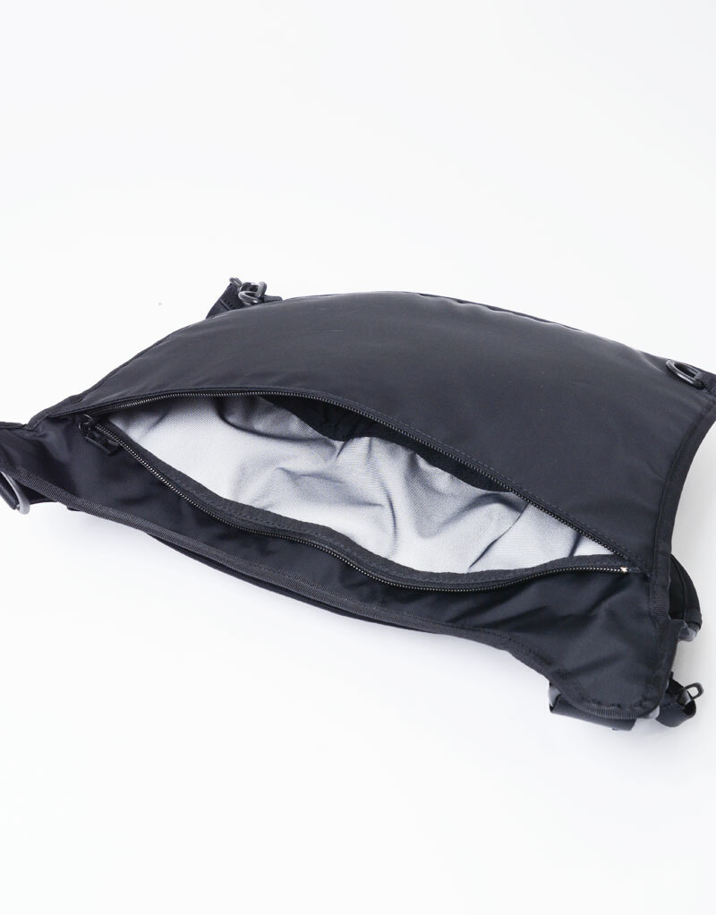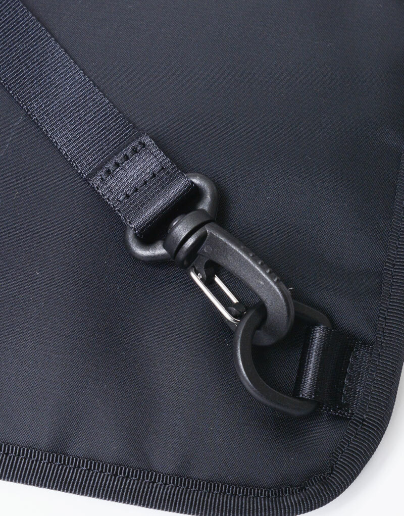 此包型可背在前側使用,順著身型的弧度、一體感的獨特設計。有束口型的瓶裝口袋設計,可將隨身物品與飲品分層收納。另外也有登山勾及可調式扣具配件設計,可掛毛巾、鑰匙等小物使用。