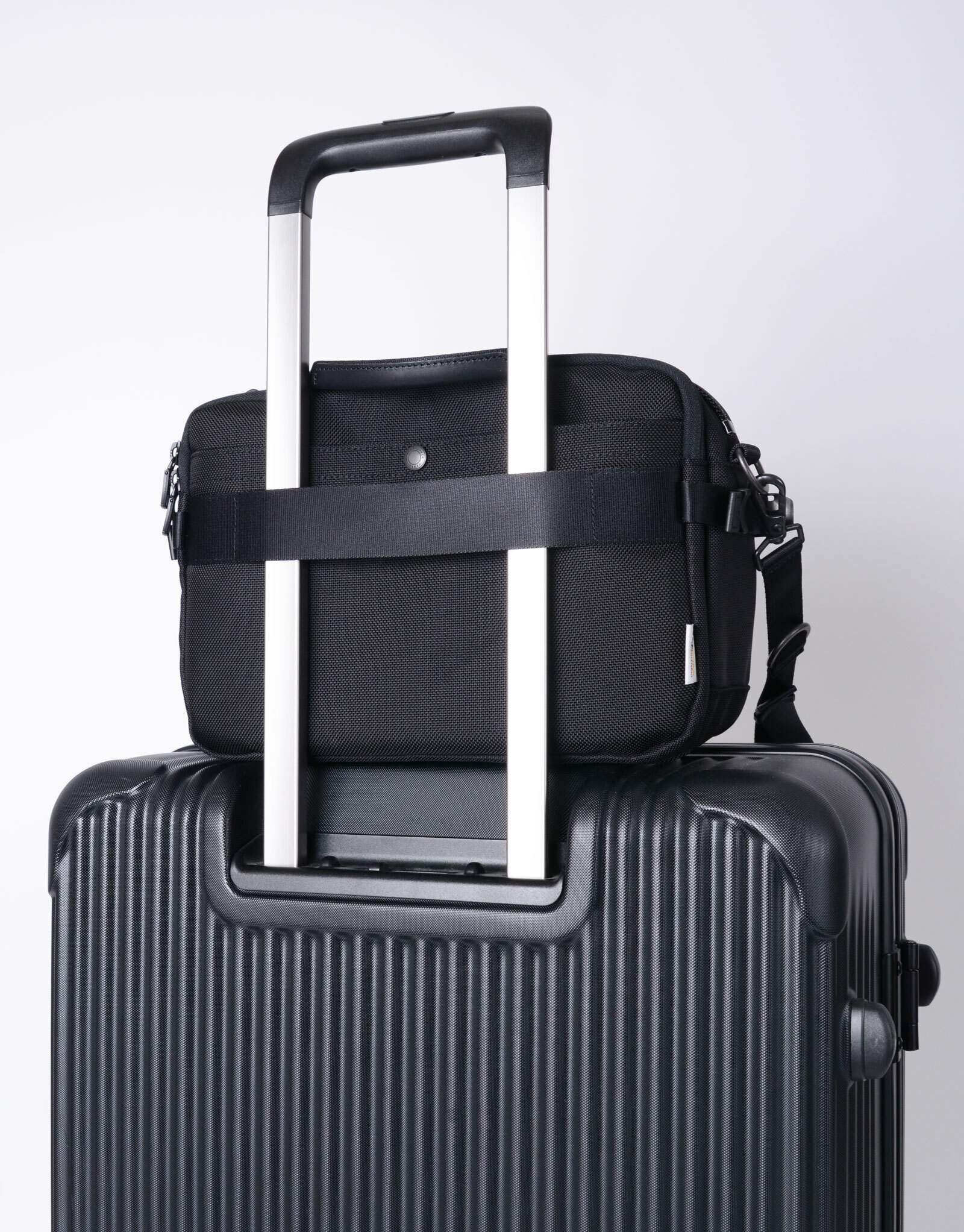 背部附有固定帶,可套掛於行李箱的拉桿上,方便旅行時使用。