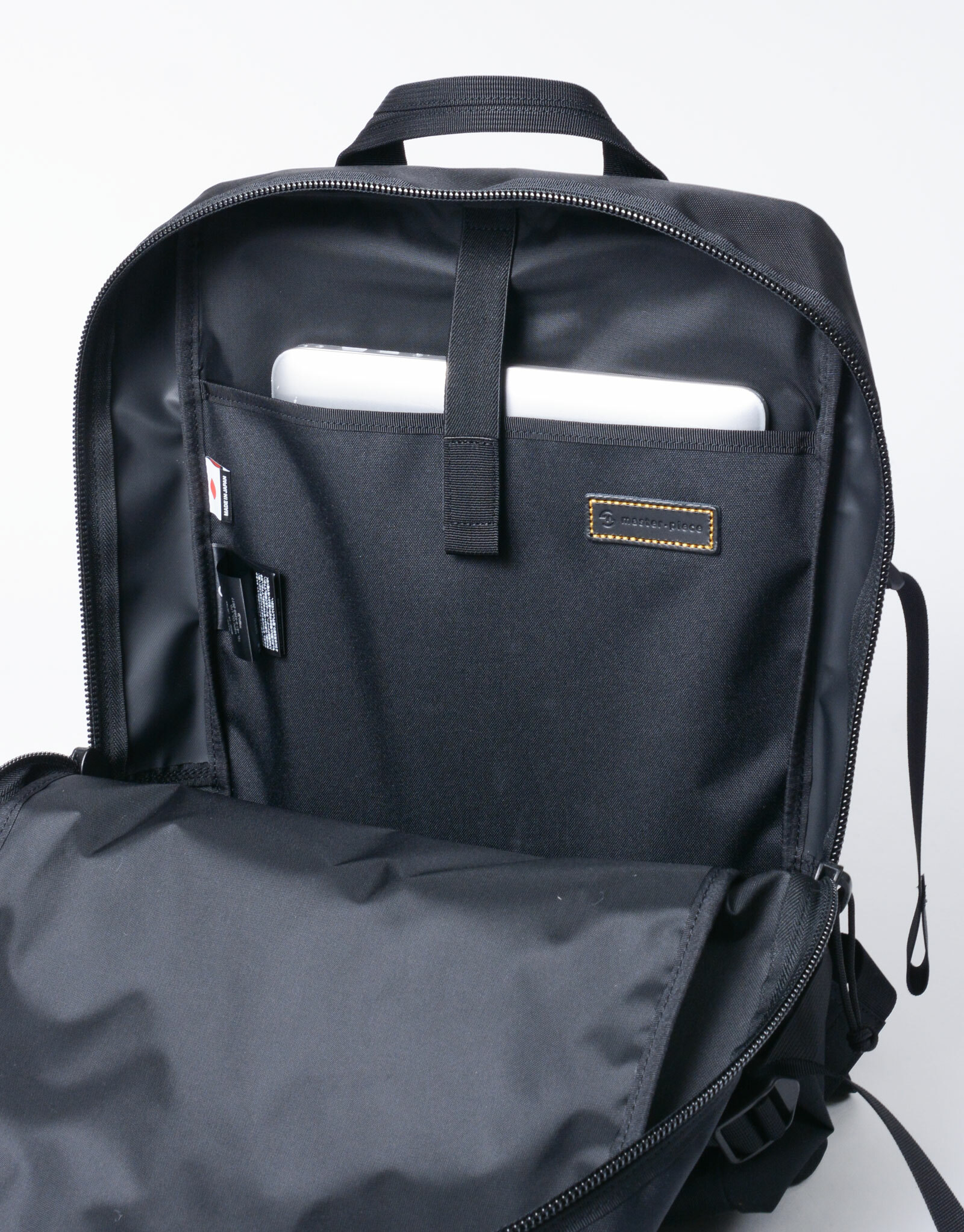 主收納空間可大幅開啟,背面設有專用夾層,可收納 16 吋 MacBook Pro。