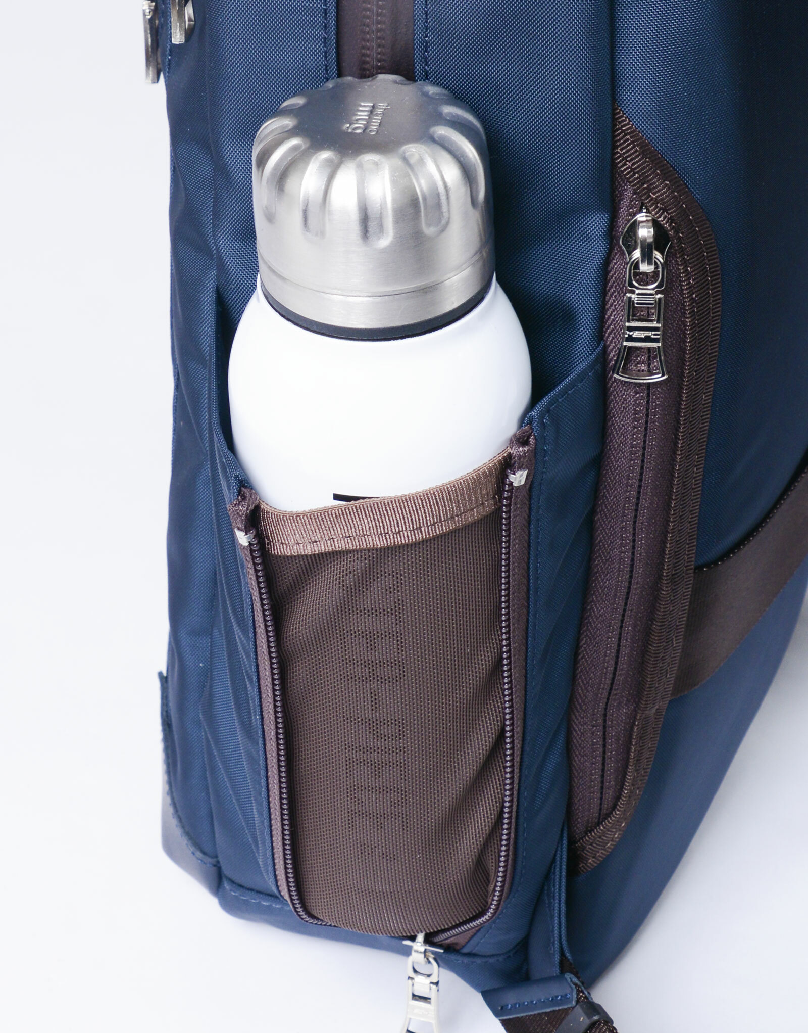 此開放式口袋可透過拉鍊擴展空間,方便收納水壺等較大物品。