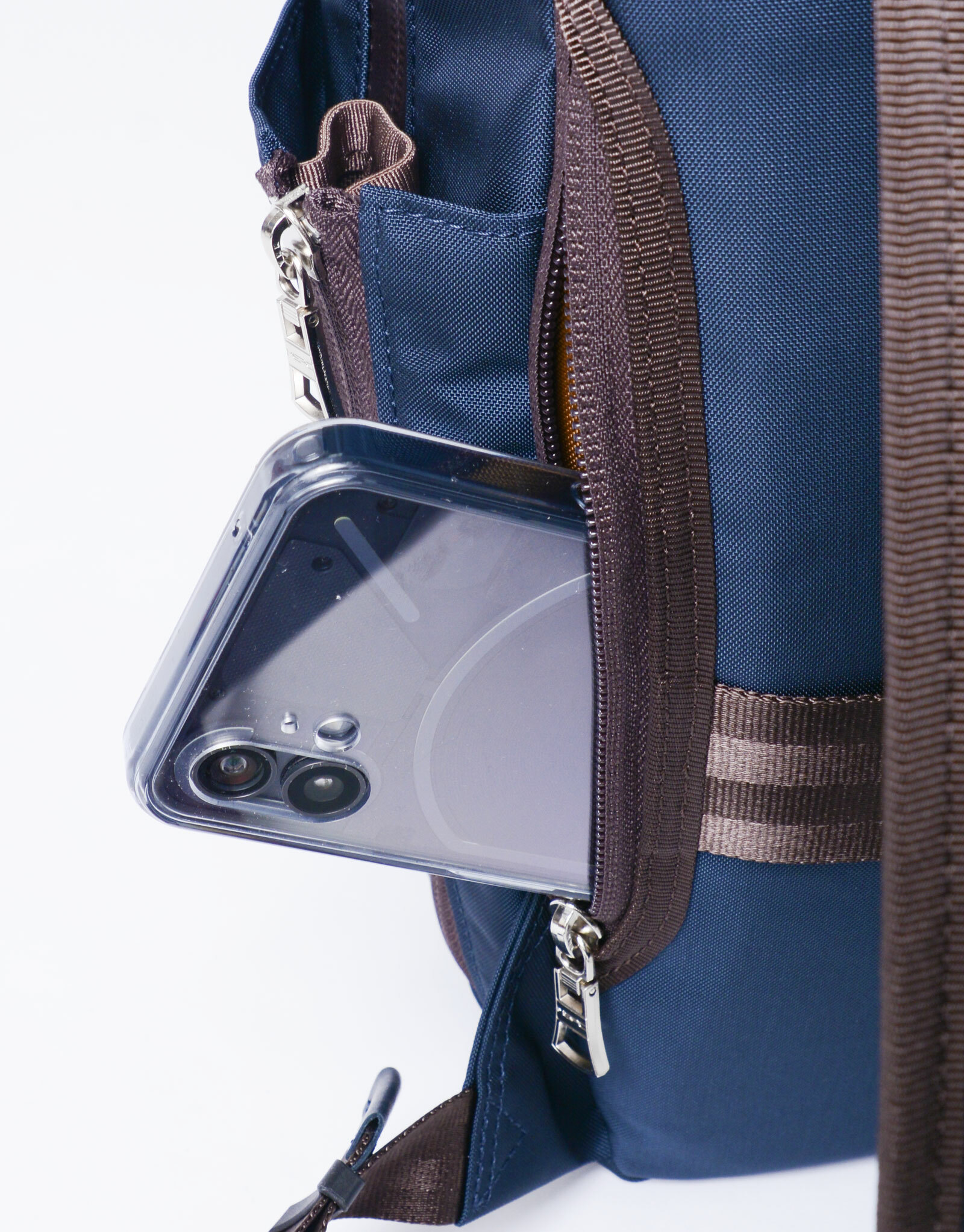 背面配有拉鍊口袋,適合存放手機等貴重物品,安全性高。