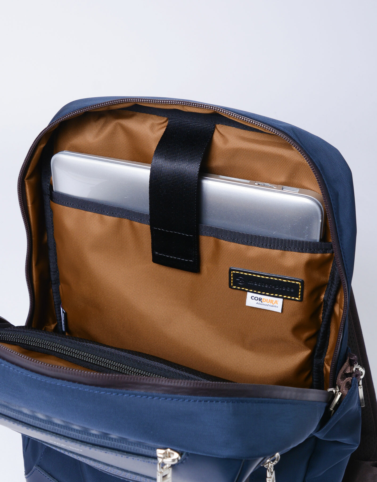 主收納空間背面設有筆電夾層,可收納 14 吋 MacBook Pro。