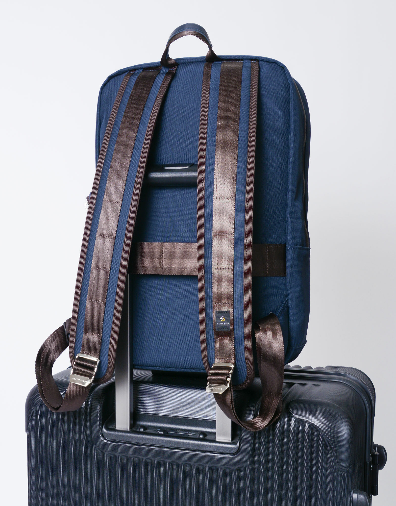 背部配置固定帶,可輕鬆套掛在行李箱拉桿上,提升出行便利性。
