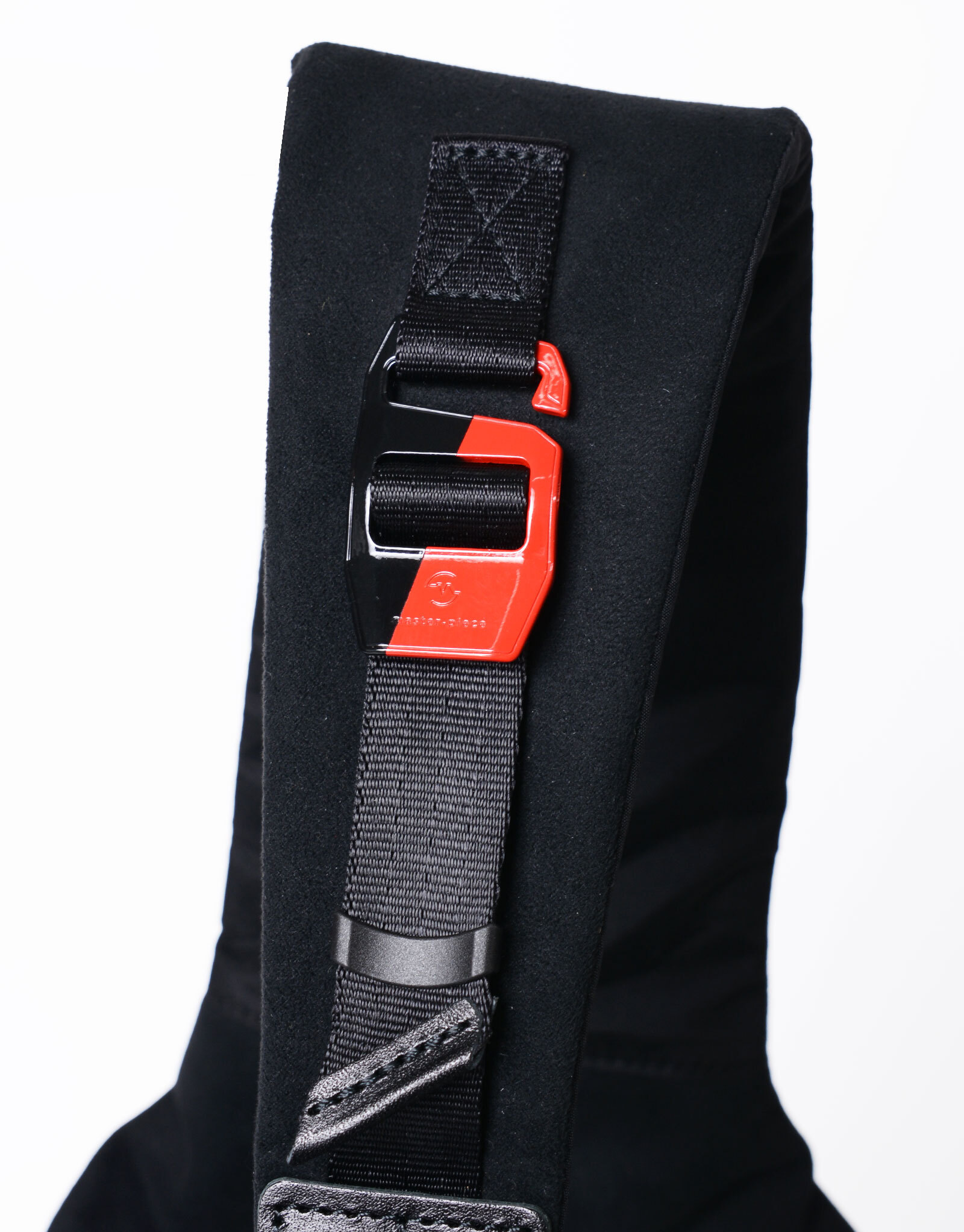 系列共通的細節設計包含可固定帽子、手套等小物的金屬製原創掛扣。