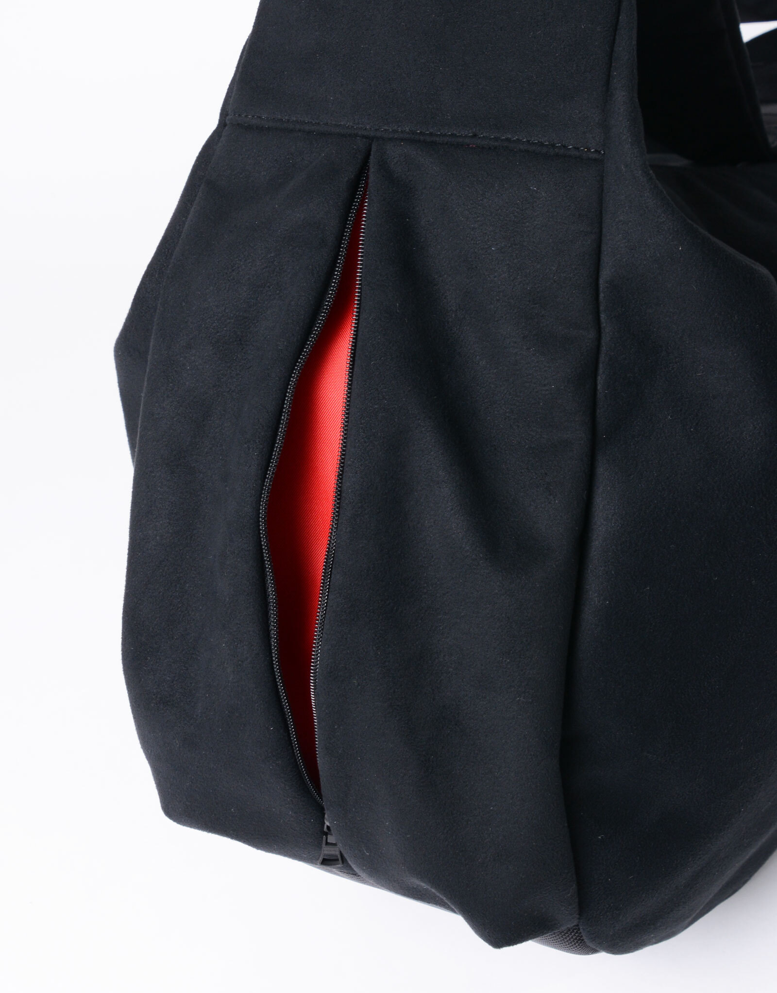 將 GR YARIS 與 GR COROLLA 座椅上所使用的麂皮布料進行再製利用(Upcycle),作為包款本體的主要素材。