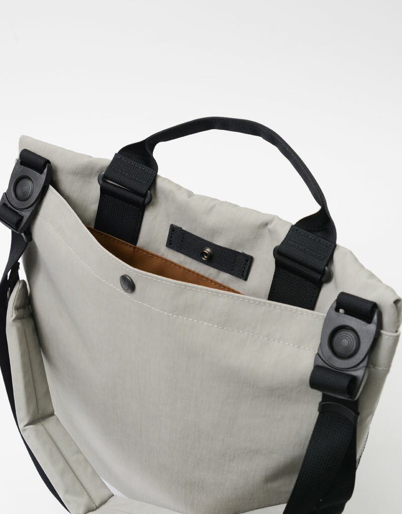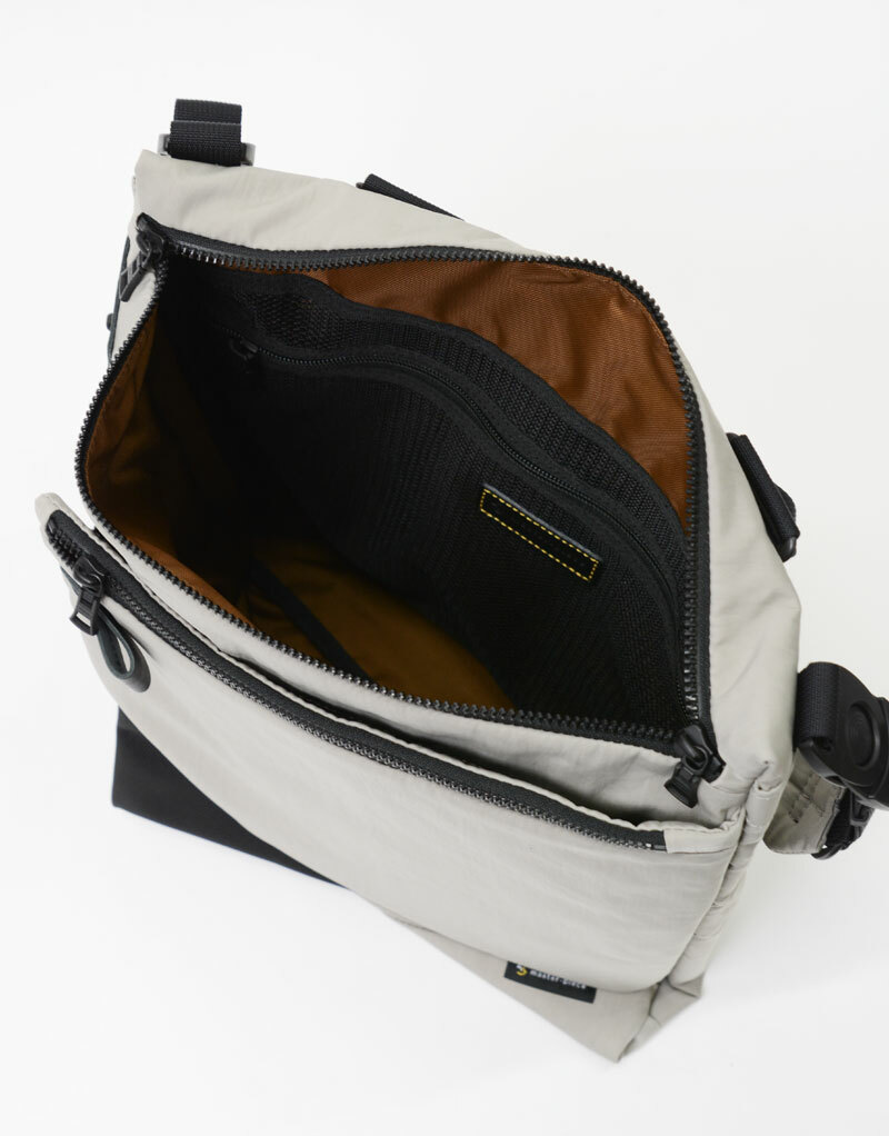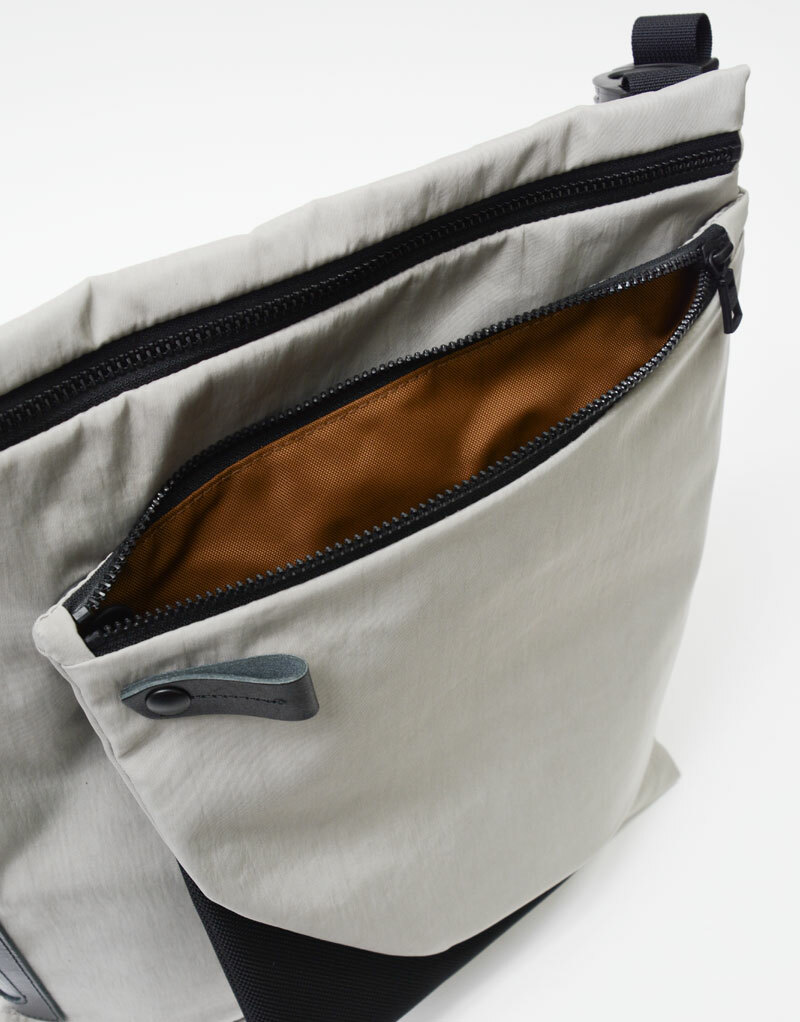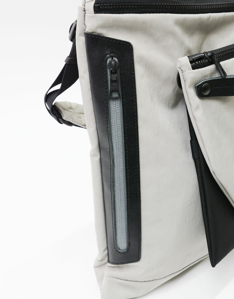 包款主體材質是由縱向110d和橫向210d的輕量高密度日本國產斜紋尼龍。材質再經由液流染色(或稱為噴射染色,是從噴嘴射出流動染料於材質上染色的工法),可以呈現自然的褶皺感以及沈穩的光澤。染色處理後,施加輕微的防潑水加工,以加強防潑水效果。