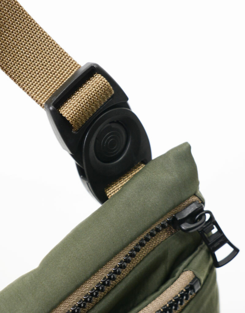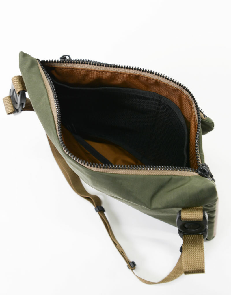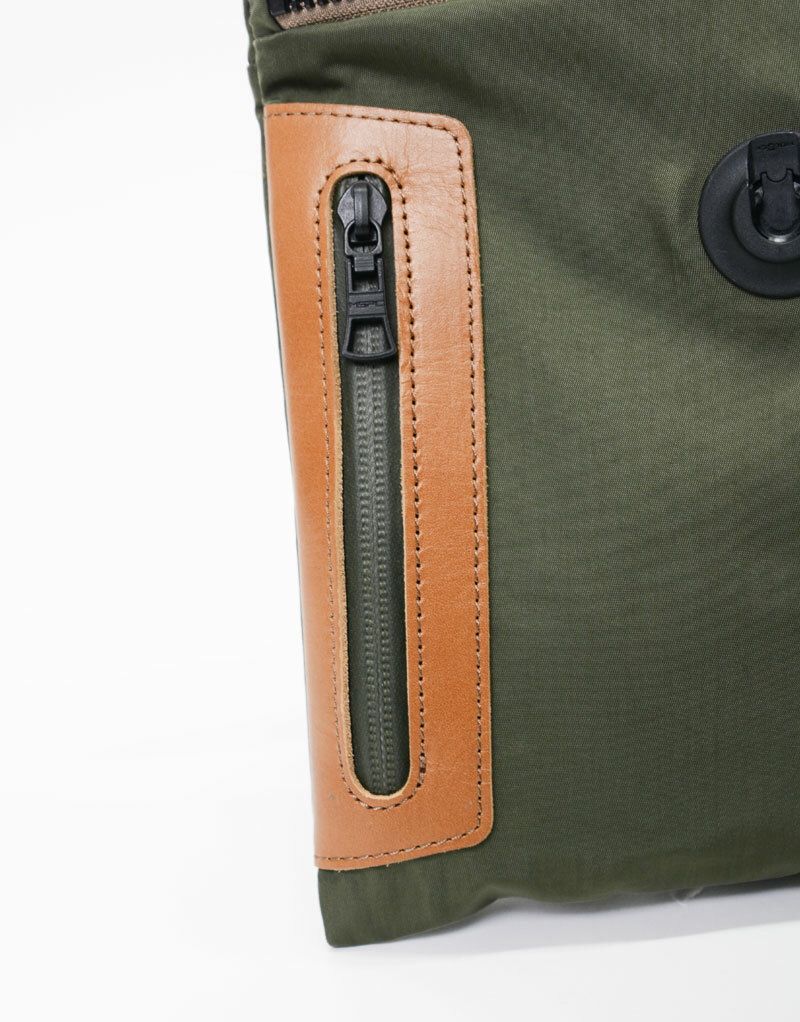 包款主體材質是由縱向110d和橫向210d的輕量高密度日本國產斜紋尼龍。材質再經由液流染色(或稱為噴射染色,是從噴嘴射出流動染料於材質上染色的工法),可以呈現自然的褶皺感以及沈穩的光澤。染色處理後,施加輕微的防潑水加工,以加強防潑水效果。