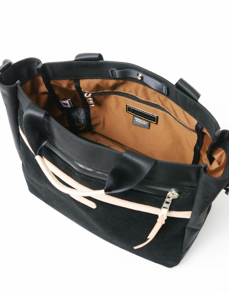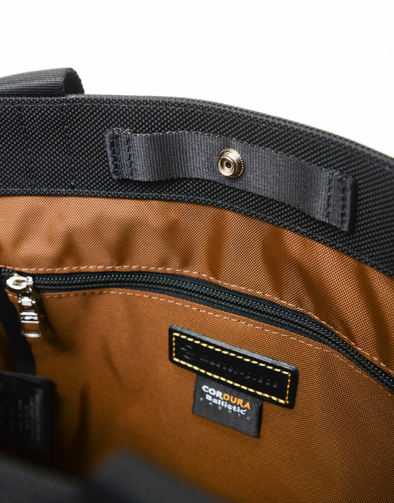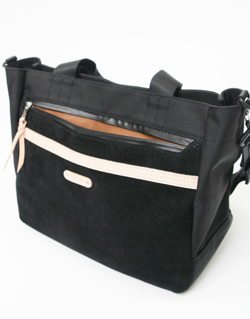 包款主材質使用的是較一般尼龍高出約5倍耐耗損、耐撕裂強度的INVISTA公司出產的 CORDURA® 1680d Ballistic尼龍,並在裏層施以PU加工以提升材質的強度。附屬皮革以北 美產的厚實牛皮經初始鉻鞣製加工處理後,將銀面(皮革的表面)與下層部分水平分割為 2mm的平均厚度,再以砂紙經職人熟練手法進行細緻的起毛加工,因皮革的厚度,初次染 色時無法透染,故進行第二道染色工序並加入防水劑一同浸透以利提升防水性。此外,對於 其他附屬皮革材質,本公司屏除一切可能導致環境污染的化學藥劑、染料等有害物質和六價 鉻,而是使用經 100% 植物鞣製的1.8mm厚的環保皮革(NISSENKEN Eco-Tex Standard 100 認證)。本系列使用CORDURA® Ballistic 1680d 尼龍、防水麂皮、YKK 公司的 AquaGuard 拉鍊等不同材質,以相同的顏色系列結合,打造了以皮革為亮點的休閒包款。