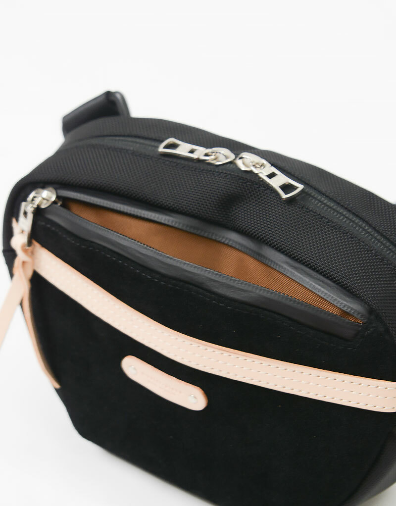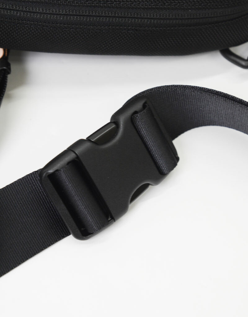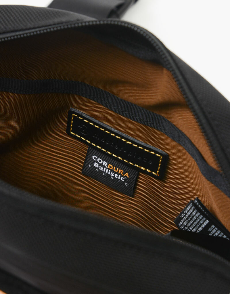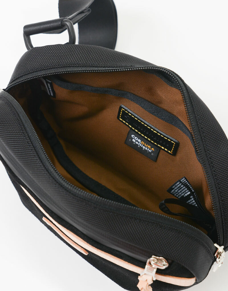 包款主材質使用的是較一般尼龍高出約5倍耐耗損、耐撕裂強度的INVISTA公司出產的 CORDURA® 1680d Ballistic尼龍,並在裏層施以PU加工以提升材質的強度。附屬皮革以北 美產的厚實牛皮經初始鉻鞣製加工處理後,將銀面(皮革的表面)與下層部分水平分割為 2mm的平均厚度,再以砂紙經職人熟練手法進行細緻的起毛加工,因皮革的厚度,初次染 色時無法透染,故進行第二道染色工序並加入防水劑一同浸透以利提升防水性。此外,對於 其他附屬皮革材質,本公司屏除一切可能導致環境污染的化學藥劑、染料等有害物質和六價 鉻,而是使用經 100% 植物鞣製的1.8mm厚的環保皮革(NISSENKEN Eco-Tex Standard 100 認證)。本系列使用CORDURA® Ballistic 1680d 尼龍、防水麂皮、YKK 公司的 AquaGuard 拉鍊等不同材質,以相同的顏色系列結合,打造了以皮革為亮點的休閒包款。