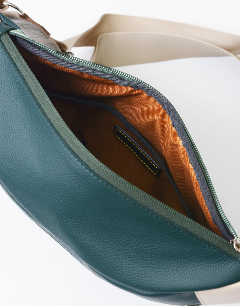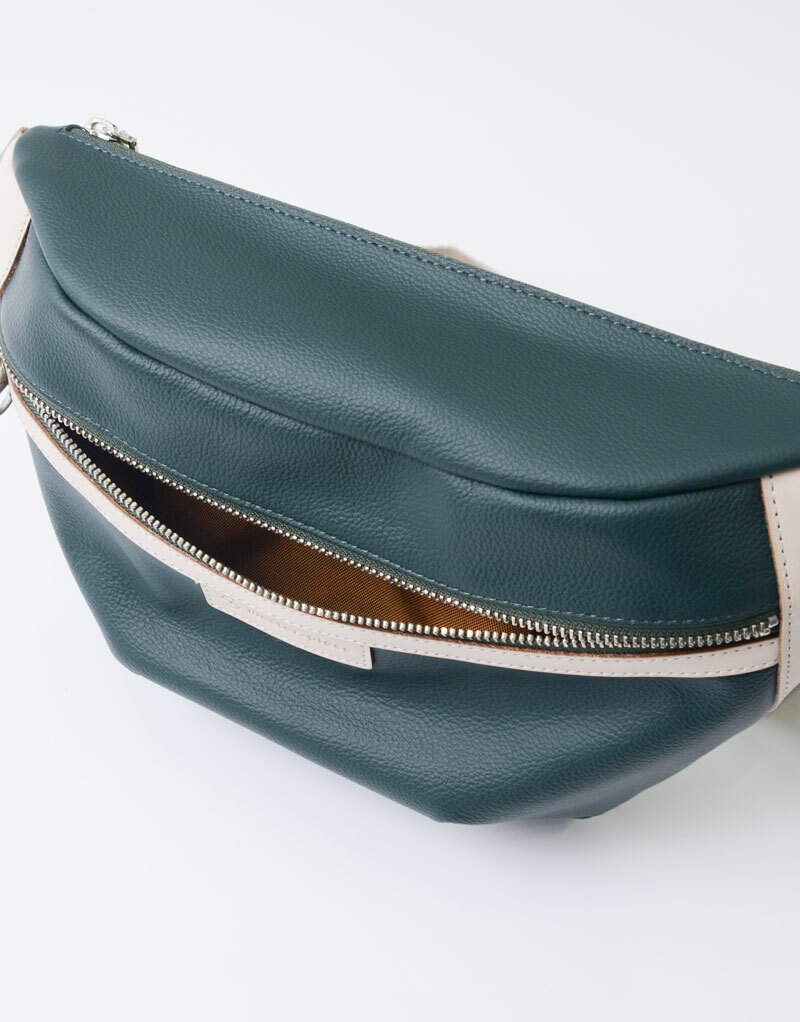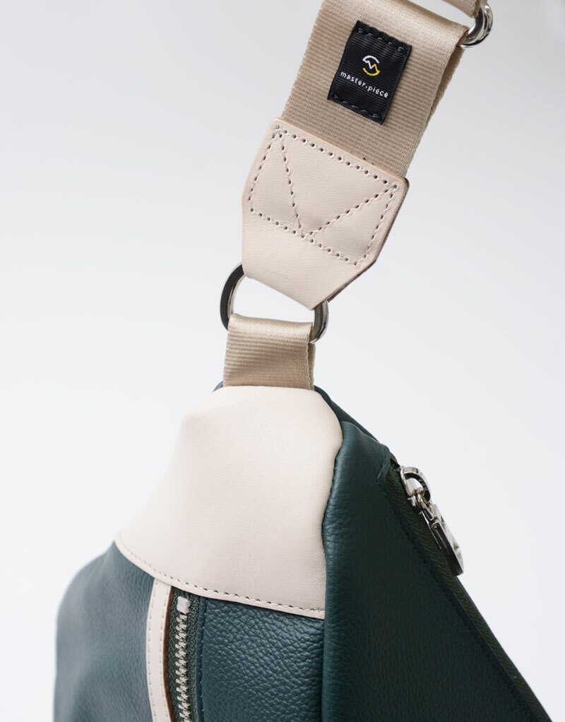 本系列在世界各地的皮革中層層篩選,最終採用來自非洲的頂級厚實小牛皮。為了增加皮革的耐磨性與耐久性,首先皮革經滾筒染色後,用砂紙將表面拋光,再用特殊的黏合劑均勻塗於表面,最後在乾燥後噴灑額外的黏合劑,藉此實現高耐久性。表面再施以皮革工場獨家研發的防潑水塗層,賦予皮革防水、抗油污的效果,可安心地對應於各種場合。透過仿自然皮革紋理的壓紋加工,使包款整體看起來更具深邃紋理與韻味。除了黑色外,本系列也有其他亮色系配色,是一款活潑明亮的腰包款式。