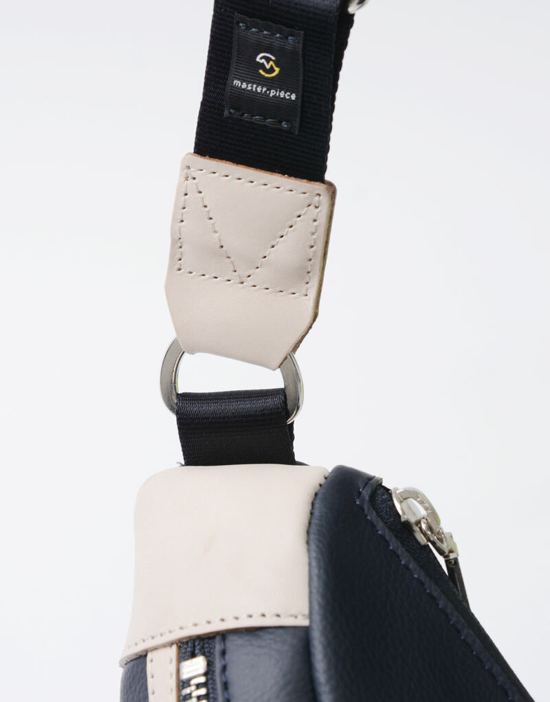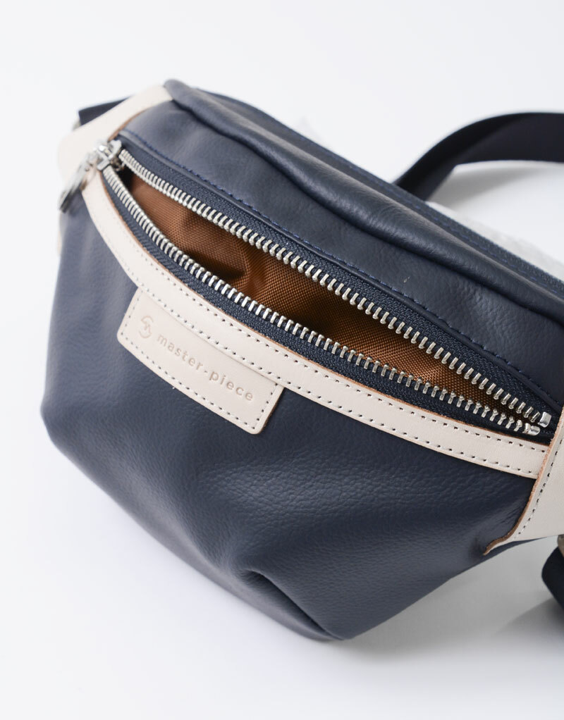 本系列在世界各地的皮革中層層篩選,最終採用來自非洲的頂級厚實小牛皮。為了增加皮革的耐磨性與耐久性,首先皮革經滾筒染色後,用砂紙將表面拋光,再用特殊的黏合劑均勻塗於表面,最後在乾燥後噴灑額外的黏合劑,藉此實現高耐久性。表面再施以皮革工場獨家研發的防潑水塗層,賦予皮革防水、抗油污的效果,可安心地對應於各種場合。透過仿自然皮革紋理的壓紋加工,使包款整體看起來更具深邃紋理與韻味。除了黑色外,本系列也有其他亮色系配色,是一款活潑明亮的腰包款式。