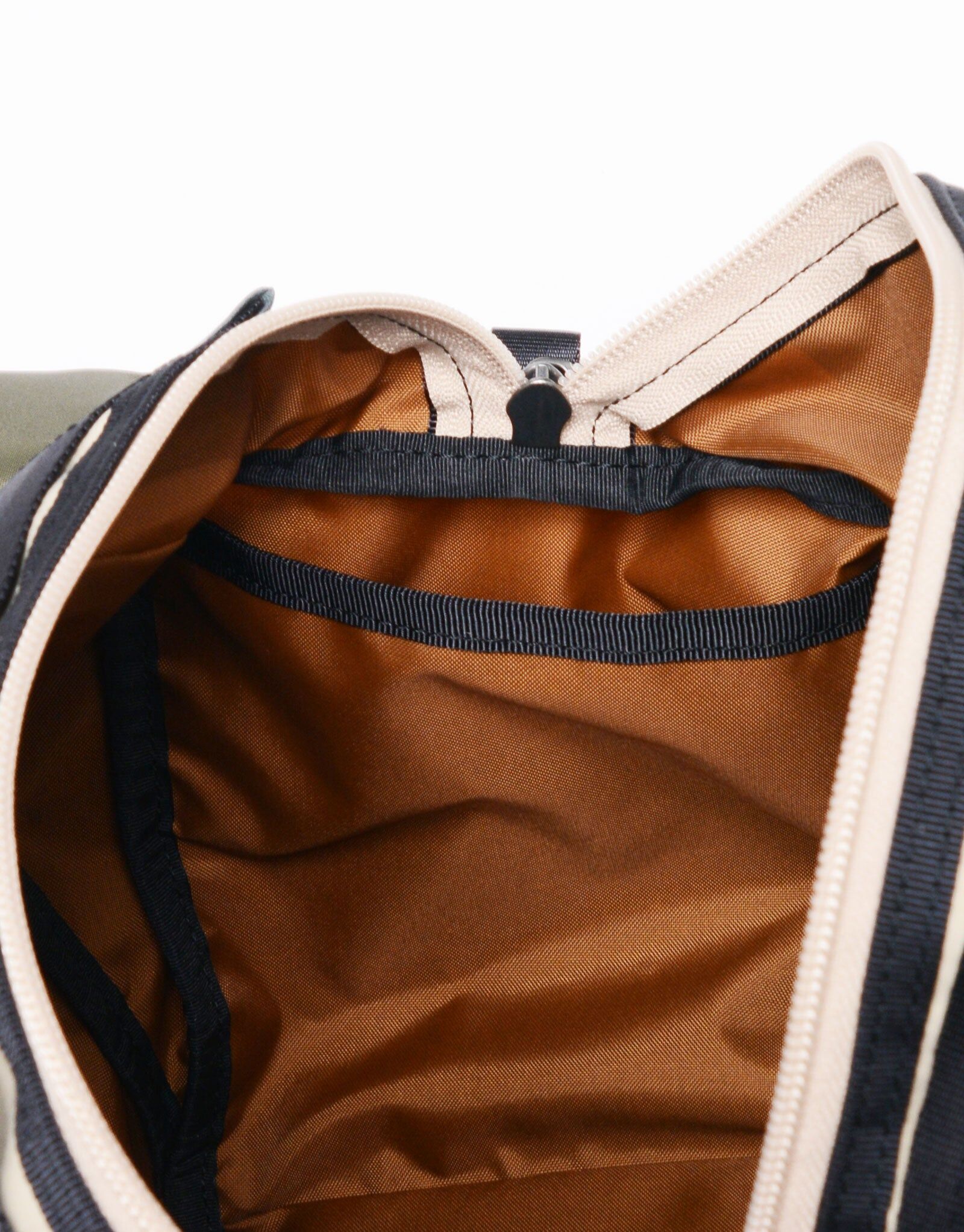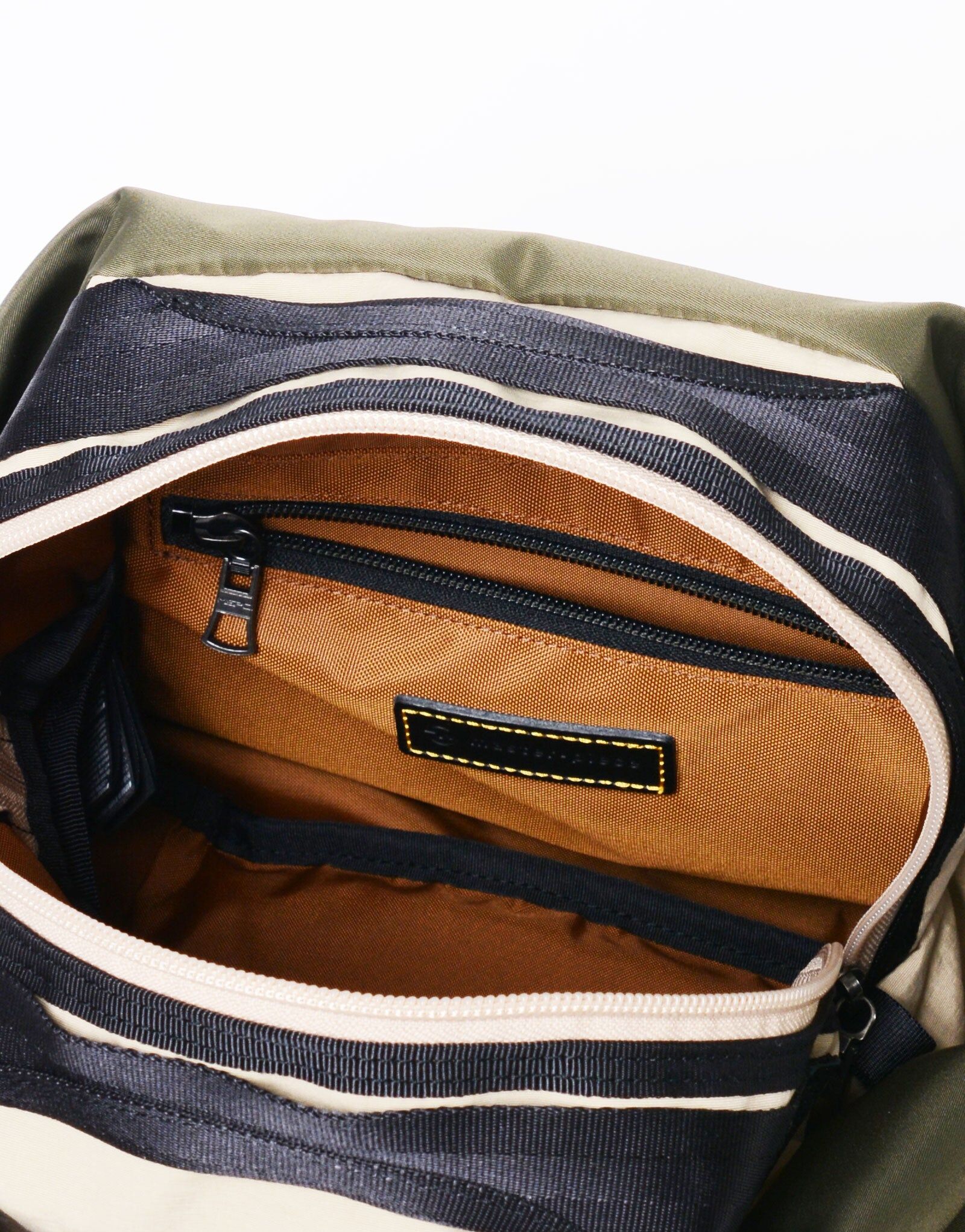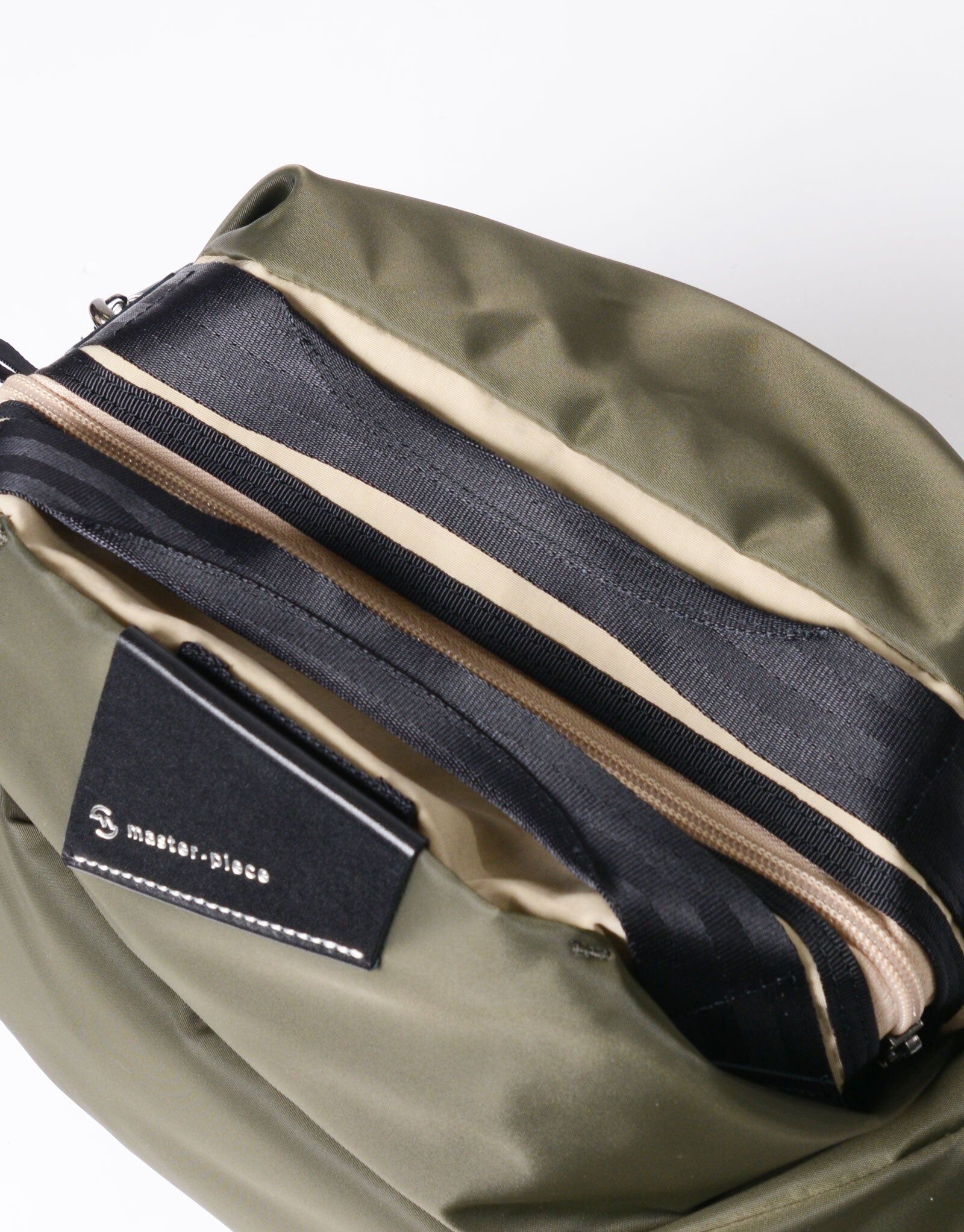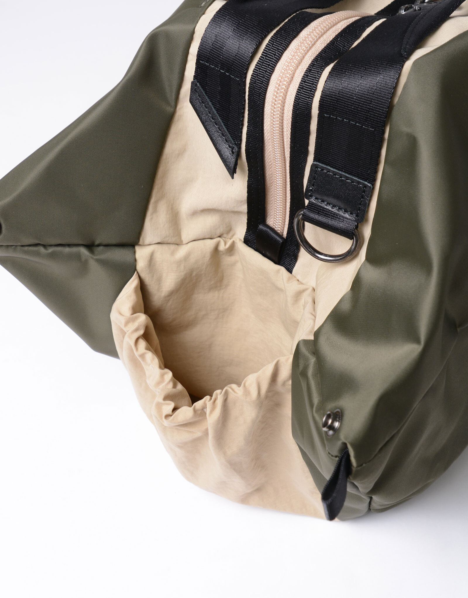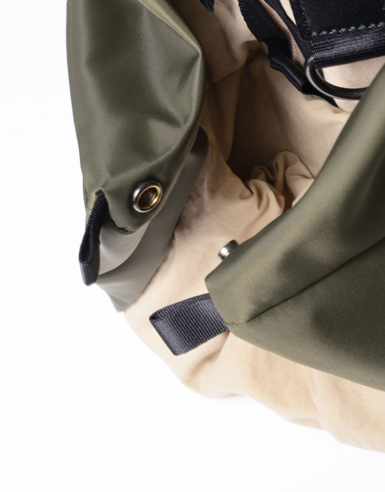 附屬布料則以縱紗70d尼龍、緯紗160d尼龍塔絲隆雙股紗織成,採用「液流染色」製程——在不拉扯布邊的狀態下加入自然皺摺進行染色,呈現出棉質般的霧面光澤與自然皺感。最終工序再施加防潑水加工,兼具耐用與實用性。