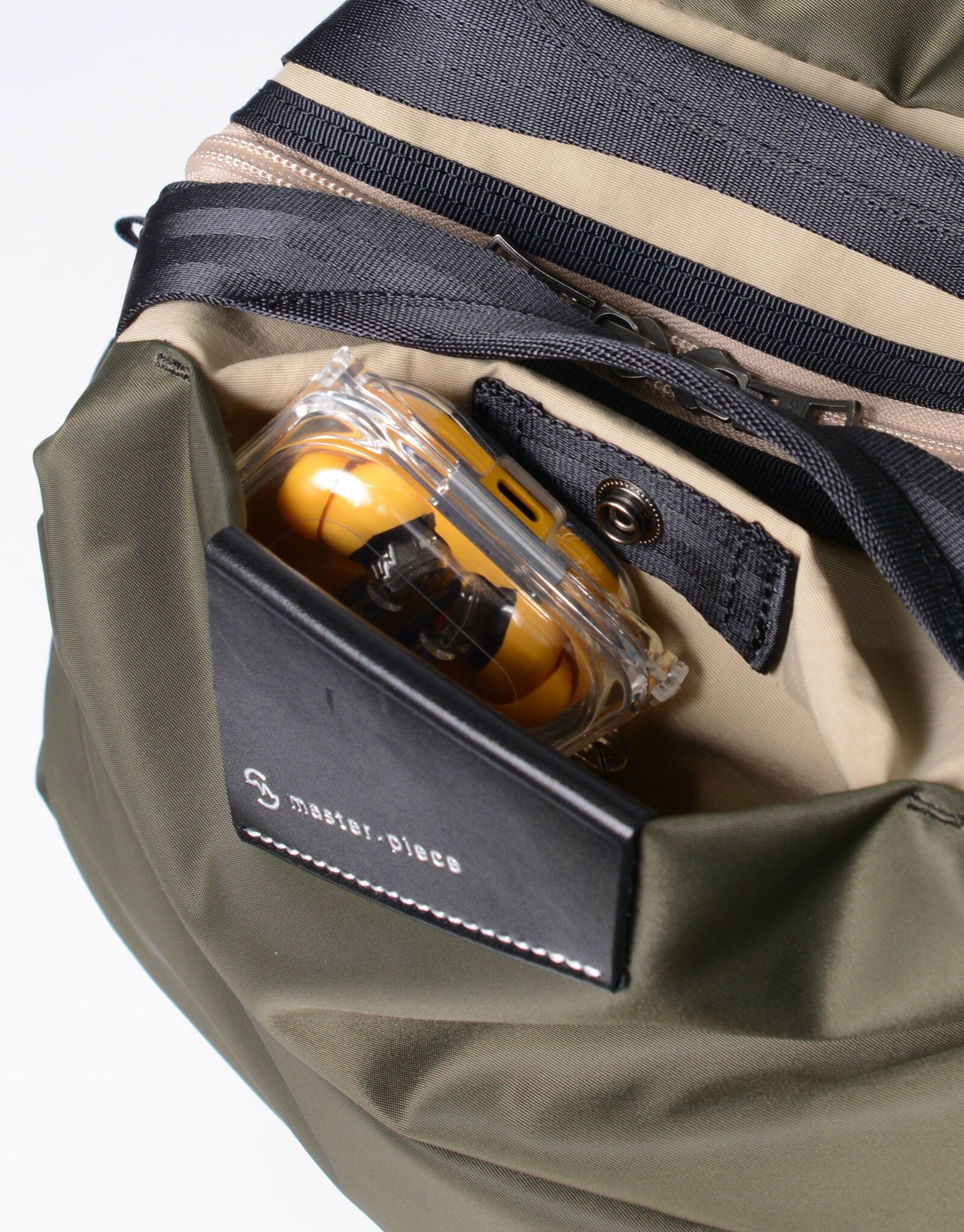 前方配置方便收納無線耳機等小物的拉鍊口袋。